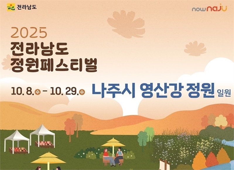 ‘2025 전남 정원페스티벌’이 10월 8일부터 29일까지 나주 영산강 정원 일원에서 열린다. 올해 주제는 ‘영산강, 정원이 되다(The Garden on the River)’로, 영산강의 자연과 역사, 문화를 정원으로 재해석해 다양한 전시와 체험, 시민 참여 프로그램을 선보인다.이번 축제는 전남도와 나주시가 공동 주최하