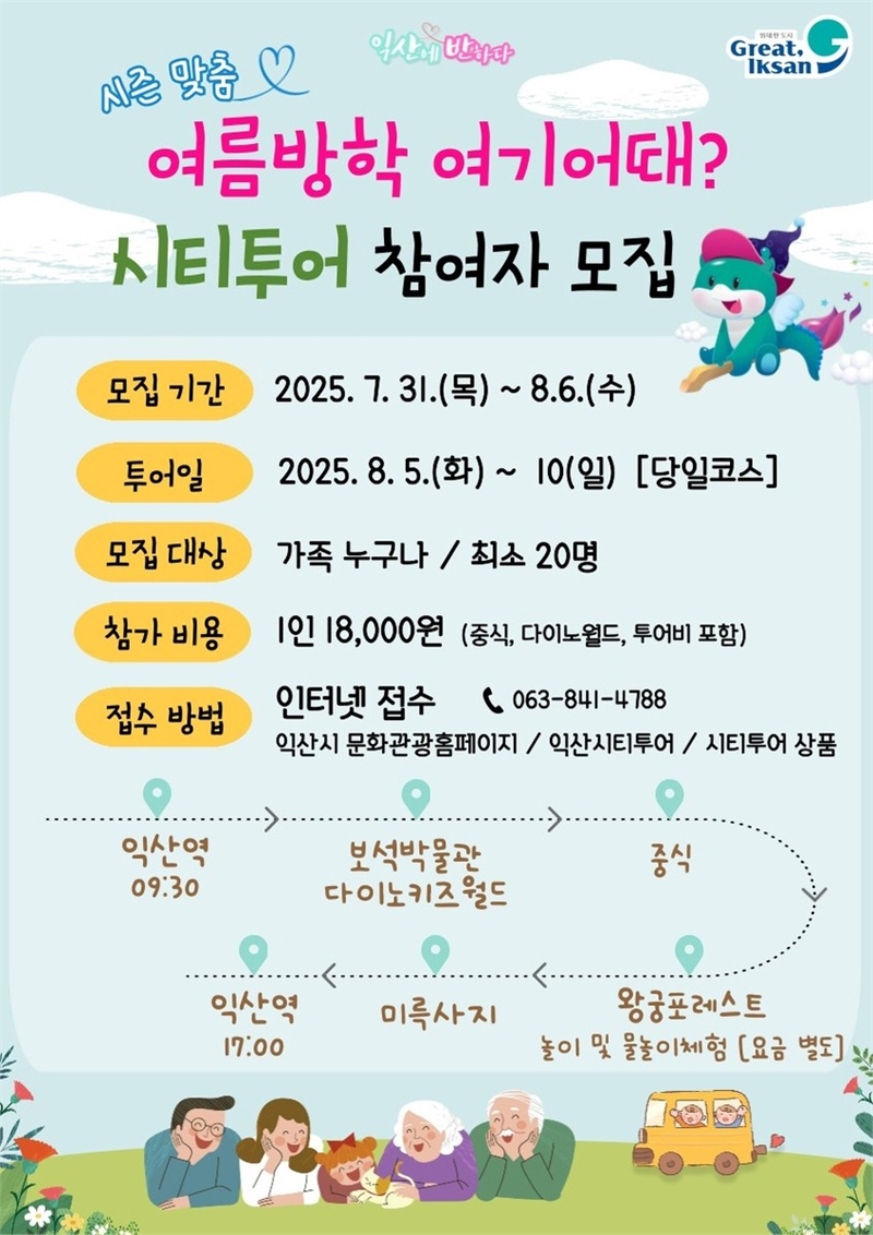 가족형 시티투어는 8월 5일부터 10일까지 6일간 진행된다. 익산역을 출발해 왕궁보석테마관광지, 다이노키즈월드, 왕궁포레스트, 미륵사지 등을 둘러보는 구성으로, 어린이와 성인 모두가 만족할 수 있는 맞춤형 코스로 설계됐다. 중식과 입장료, 버스 이용료를 포함한 요금은 1인당 1만 8000원이며, 익산시 누리집의 ‘문화·관광 바로가기’ 메뉴에서 신청할 수 있다.