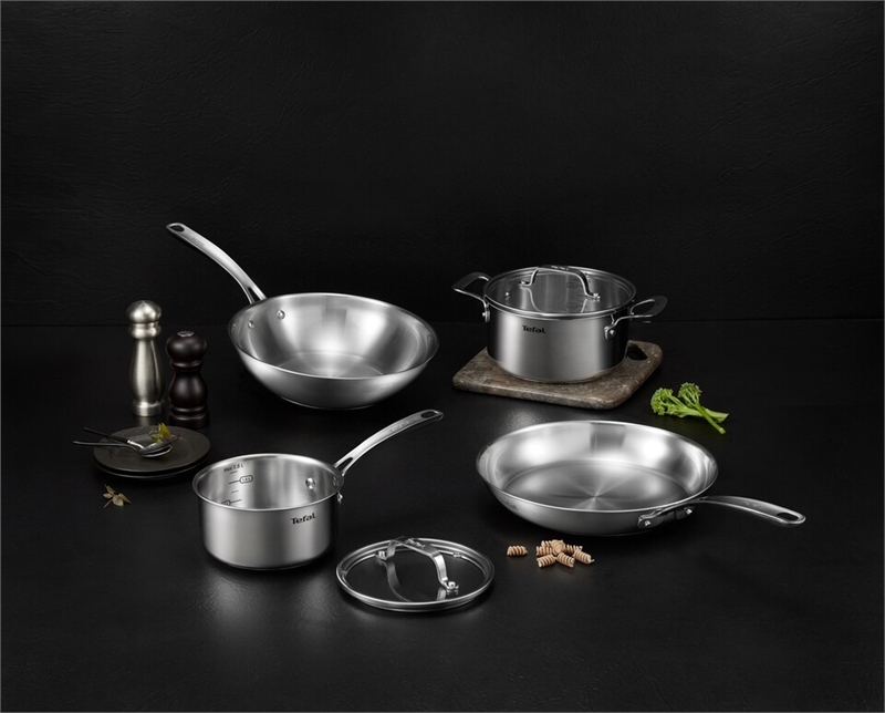 ‘인덕션 스테인리스 스틸 티타늄 3X 퍼펙트 레지스트’는 스테인리스 스틸의 견고함과 논스틱 코팅의 장점을 결합한 제품이다. 테팔 티타늄 3X 코팅으로 논스틱 성능과 긁힘 저항성을 강화했고, 5.2mm 두께의 3중 인덕션 바닥 구조와 열 센서를 탑재해 최적의 조리 시점을 안내한다. 프라이팬 3종, 볶음팬, 뚜껑 포함 소테팬 등 총 5종으로 구성됐다.