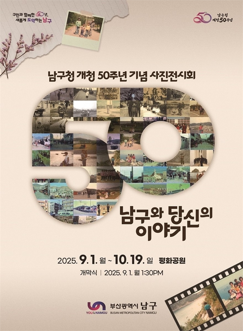 부산 남구가 개청 50주년을 맞아 주민들과 함께 역사를 돌아보는 특별한 사진 전시회를 연다. ‘남구와 당신의 이야기’를 주제로 한 이번 전시는 9월 1일부터 10월 19일까지 평화공원 산책로에서 무료로 만나볼 수 있다.