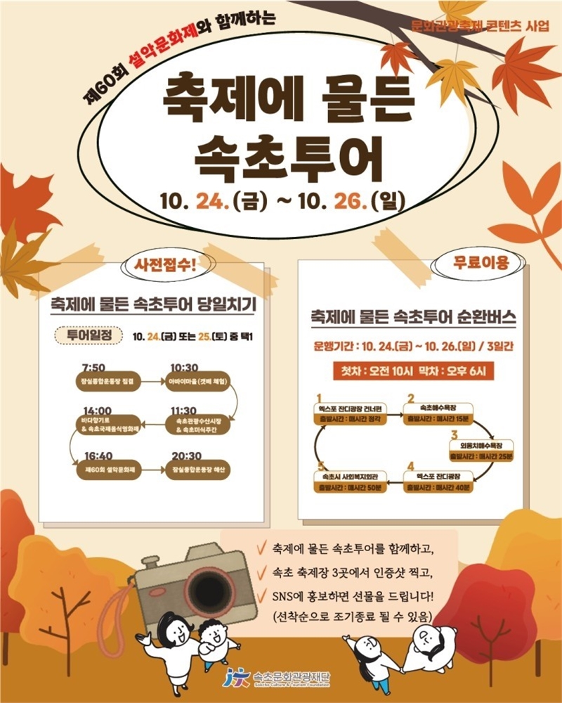이번 프로그램은 가을철 속초의 대표 문화행사인 ▲제60회 설악 문화제 ▲마숩다! 속초 ▲2025 속초 미식 주간과 연계해 운영돼 축제의 풍성함을 더한다. 또한 설악 문화제 기간에는 속초 주요 관광지와 축제장을 연결하는 무료 순환버스가 운행돼 방문객들이 보다 편리하게 행사를 즐길 수 있다.