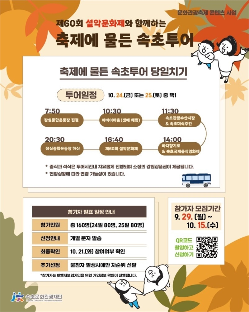 서울 잠실종합운동장에서 출발해 속초 주요 관광지와 축제 현장을 둘러보는 당일 버스투어 형식으로 진행되며, 참가자들에게는 속초관광수산시장과 로데오거리 일대에서 자유롭게 식사할 수 있도록 강원 상품권 1만5천 원권이 제공된다. 참가비는 무료이며, 신청은 9월 29일부터 10월 15일까지 선착순으로 접수 가능하다. 신청 방법은 포스터를 통해 확인할 수 있다.