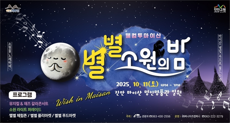 전북 진안군은 오는 11일 오후 4시부터 마이산 명인명품관 야외광장에서 ‘웰컴투 마이산, 별별 소원의 밤’ 행사를 개최한다고 밝혔다. 이번 행사는 가을밤 마이산의 정취 속에서 음악과 체험, 소망을 나누는 참여형 야간 축제로 꾸며진다.