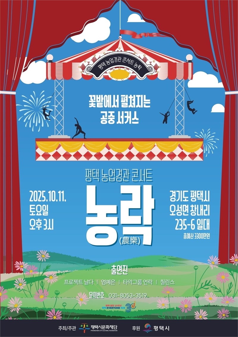 이상균 평택시문화재단 대표이사는 “농락은 농업과 예술이 만나 평택만의 새로운 풍경과 감동을 만들어내는 자리”라며 “코스모스와 황금 들녘, 석양이 어우러지는 무대에서 시민들에게 잊지 못할 가을의 순간을 선사할 것”이라고 말했다.