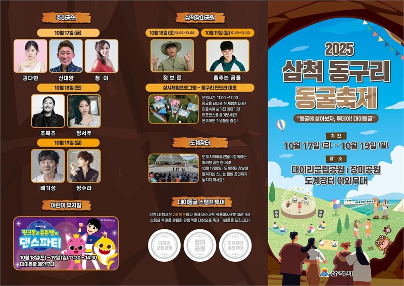 삼척시가 주최하는 ‘삼척 동구리 동굴축제’가 오는 10월 17일부터 19일까지 사흘간 대이리군립공원, 삼척장미공원, 도계장터 야외무대 등 3곳에서 동시에 열린다. 올해 축제 슬로건은 ‘동굴에 살아보자, 투데이! 대이동굴’로, 가족 공연과 실감형 체험, 도심과 생활권을 연결한 셔틀형 분산 운영이 특징이다.