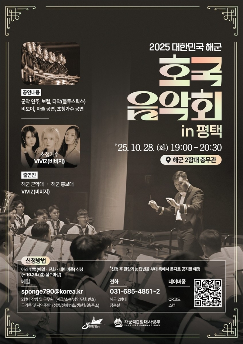 이번 공연은 무료로 진행되며, 전화(031-685-4851~2), 이메일 또는 QR코드를 통해 사전 관람 신청이 가능하다. 해군 2함대 관계자는 “평택 시민과 함께하는 이번 호국음악회가 해군의 자긍심과 국민의 응원을 하나로 잇는 뜻깊은 자리가 되길 바란다”고 전했다.