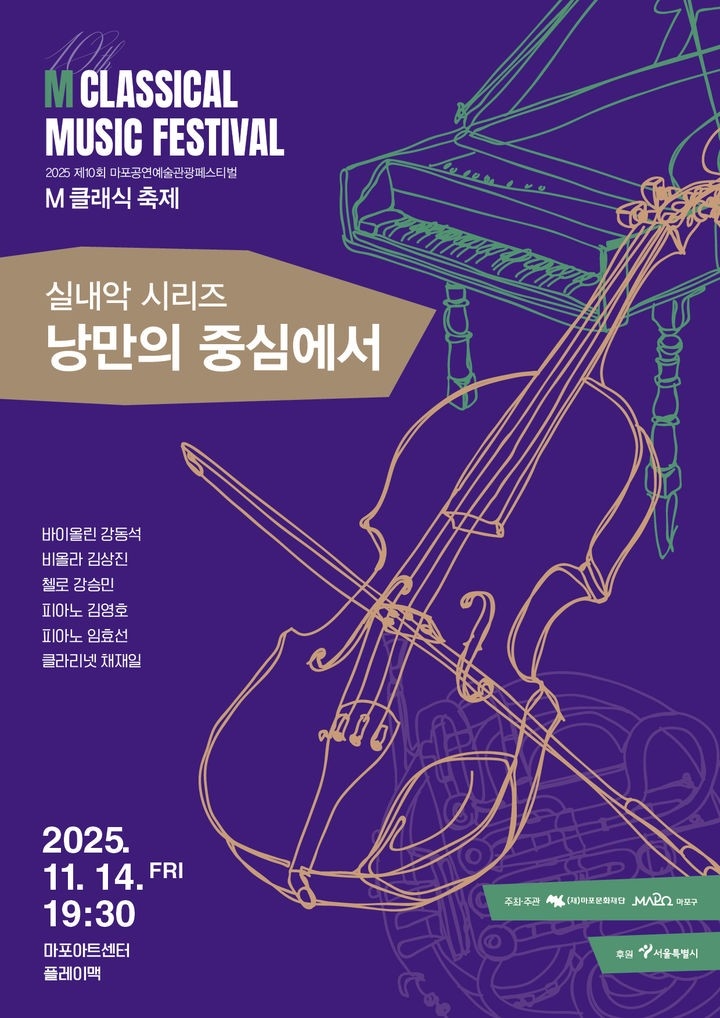마포문화재단은 오는 11월 14일 실내악 시리즈 ‘낭만의 중심에서’를 개최한다고 밝혔다. 이번 공연은 ‘2025 제10회 M 클래식 축제’의 일환으로, 바이올리니스트 강동석을 중심으로 국내외 클래식 거장들이 한자리에 모여 실내악의 진수를 선보일 예정이다.