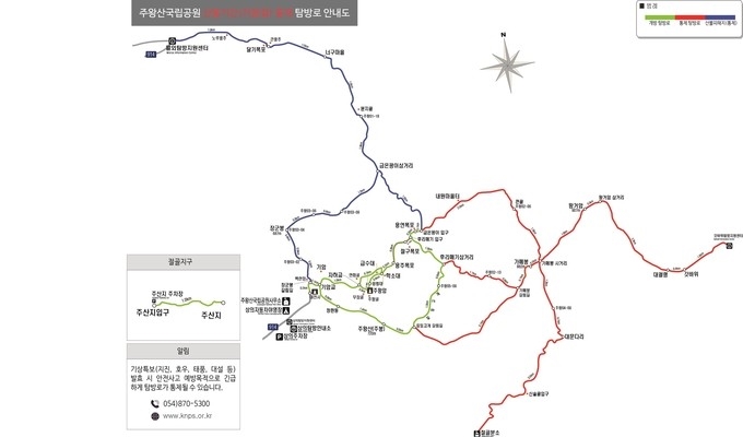 통제되는 주요 구간은 절골입구~대문다리~가메봉, 금은광이입구~내원마을터~가메봉사거리 등으로, 산불 시 진화가 어려운 능선부 코스가 대부분이다. 반면, 주왕산의 대표 명소인 주산지와 대전사~용연폭포 구간 등 핵심 탐방로 22.2㎞는 정상적으로 개방돼 단풍을 즐기려는 탐방객들이 불편 없이 방문할 수 있다.