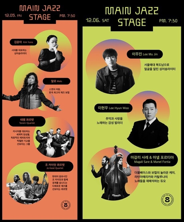 메인 스테이지에는 싱어송라이터 김윤아, 이무진, 이현우, 말로 등이 참여하며, 해외 공연으로는 러시아의 세계적 앙상블 테렘 콰르텟, 프랑스의 조 카이앗 콰르텟, 스페인의 마갈리 사레&마넬 포르티아, 형제 듀오 재즈 그룹 에코윈드 등이 무대에 오른다.