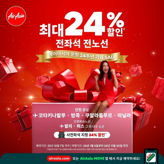 에어아시아가 운항 24주년을 맞아 전 좌석과 전 노선을 대상으로 최대 24% 할인 프로모션을 진행한다고 밝혔다.