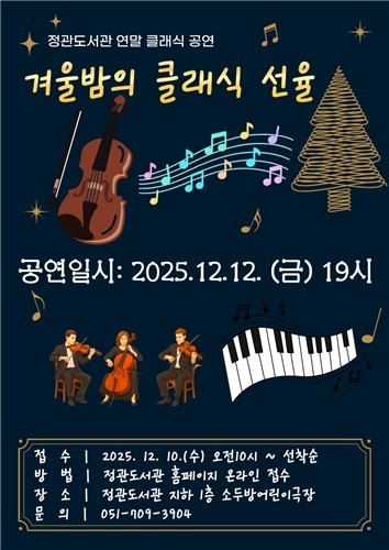 기장군은 연말을 맞아 오는 12일 정관도서관에서 지역 주민들에게 따뜻한 감성과 휴식을 전하는 ‘겨울밤의 클래식 선율’ 공연을 마련했다고 밝혔다. 이번 행사는 도서관에서 여유로운 겨울밤을 즐길 수 있도록 구성된 문화 프로그램으로, 주민들의 문화 향유 기회를 넓히기 위한 취지로 기획됐다.