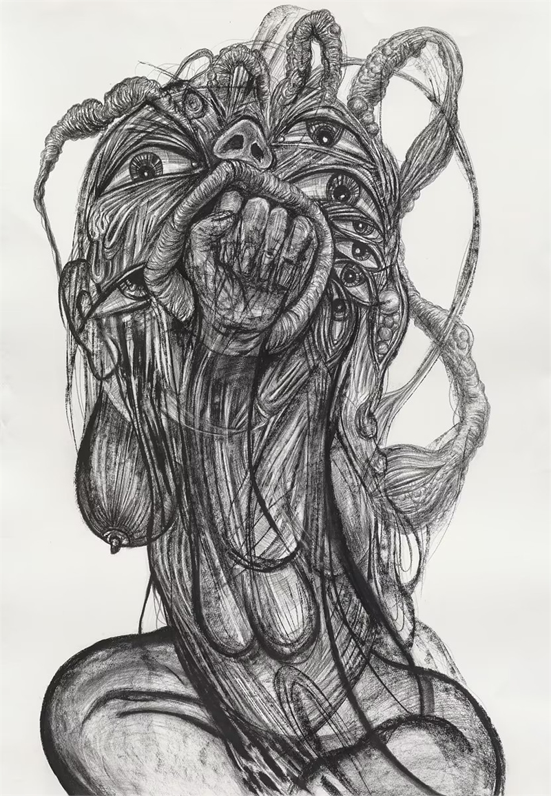 장파(b. 1981) 〈Drawing for Gore Deco #1〉 2025, Charcoal on paper, 112 x 76 cm, Courtesy of the artist and Kukje Gallery, 사진: 안천호 (국제갤러리 제)