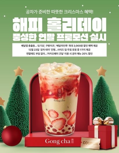 공차코리아(Gong cha Korea)는 연말을 맞아 한 해 동안 고객들이 보내준 성원에 보답하기 위해 다양한 제휴 채널을 연계한 ‘해피 홀리데이’ 시즌 프로모션을 진행한다고 밝혔다. 이번 프로모션은 공차 단독 행사인 공차 데이를 비롯해 요기요, 쿠팡이츠, 배달의민족, 카카오페이 등 주요 플랫폼과 협업해 순차적으로 운영된다.