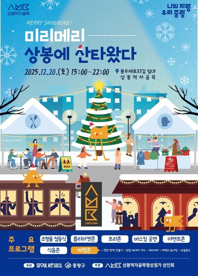 중랑구는 오는 20일 제2호 상봉먹자 골목형상점가인 봉우재로33길 일대에서 연말 분위기를 느낄 수 있는 겨울축제 ‘미리메리 상봉에 산타왔다’를 개최한다고 밝혔다. 이번 행사는 크리스마스의 설렘과 겨울 정취를 담은 주민 참여형 축제로 마련됐다.