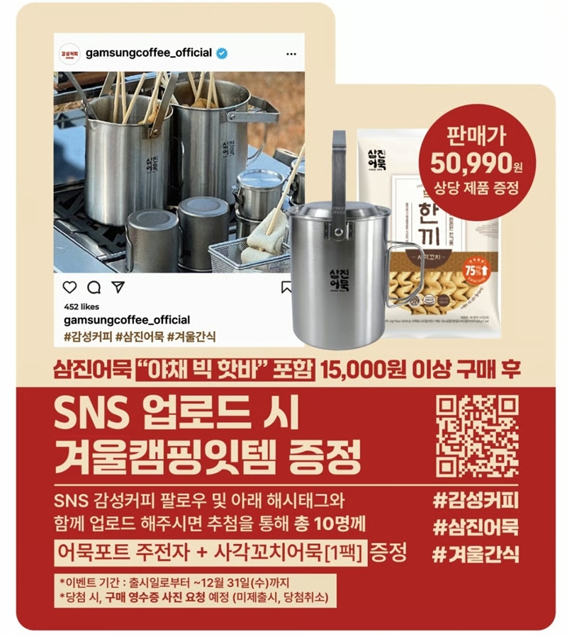 감성커피 관계자는 “카페에서도 겨울철 따뜻한 간식을 찾는 고객 수요가 꾸준히 늘고 있다”며 “삼진어묵과의 협업을 통해 계절에 어울리는 메뉴와 즐길 거리를 동시에 제공하고자 했다”고 밝혔다.