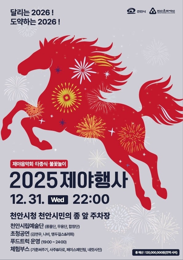 행사는 31일 오후 7시 지역 예술인들의 공연으로 문을 연다. 이후 제야음악회와 타종식, 불꽃놀이가 차례로 이어지며 새해의 시작을 알린다. 무대에는 천안시립흥타령풍물단과 천안시립무용단, 천안시립합창단을 비롯해 앵두걸스와 려화(K-EDM), 가수 나비와 김연우가 축하공연을 펼칠 예정이다.