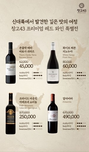 이번 프로모션은 1월과 2월 두 달간 전국 창고43 매장에서 진행된다. 대상 와인은 △화이트 헤븐 피노누아(뉴질랜드) △쏜클락 떼라 바로사 쉬라즈(호주) △프라이드 마운틴 빈야드 까베르네 쇼비뇽(미국) △알마비바(칠레) 등 신대륙을 대표하는 레드와인 4종으로, 정상가 대비 최대 32% 할인된 가격에 제공된다.