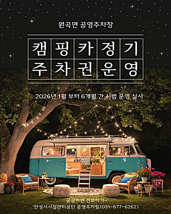 안성시시설관리공단이 캠핑 인구 증가로 늘어난 주차 수요에 대응하기 위해 원곡면 공영주차장에서 ‘캠핑카(카라반 포함) 정기주차권’을 1월부터 시범 운영한다고 밝혔다. 캠핑카 보유 대수가 빠르게 늘었지만 아파트 단지 내 주차 제한 등으로 장기주차 공간이 부족해지면서, 주택가 불법 주차와 관련 민원을 줄이고 공영주차장의 공익적 기능을 회복하겠다는 취지다.