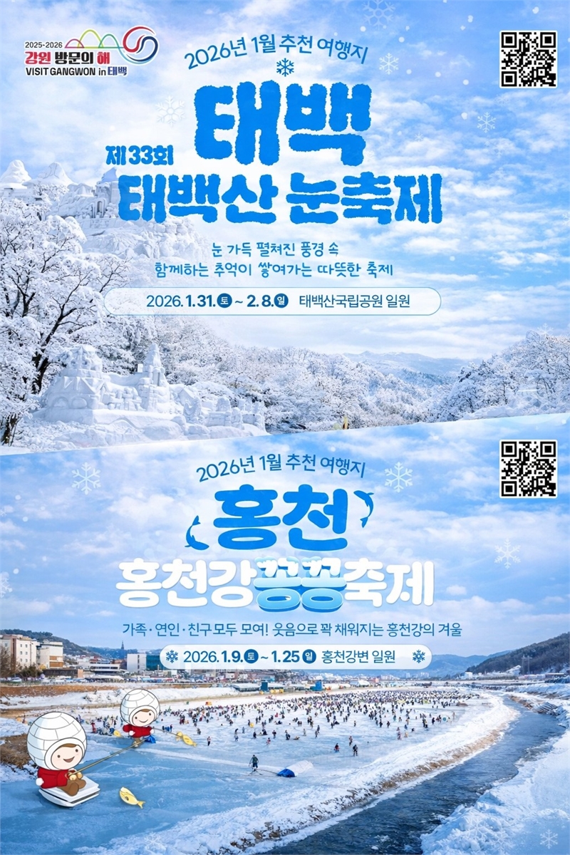 강원특별자치도와 강원관광재단은 ‘2026 강원방문의 해’ 1월 추천 여행지로 태백시와 홍천군을 선정했다고 23일 밝혔다. 도와 재단은 한겨울 강원의 매력을 대표하는 두 지역의 축제를 중심으로 겨울 관광 수요를 적극적으로 끌어올린다는 계획이다.태백시에서는 내년 1월 31일부터 2월 8일까지 태백산 국립공원 일원에서 태백산