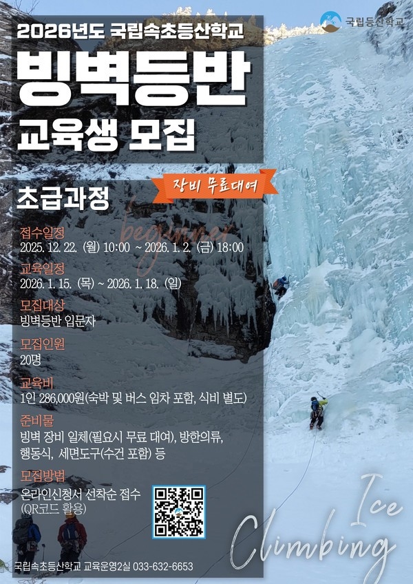 산림청 산하 한국등산·트레킹지원센터는 겨울 산악 스포츠의 대표 종목인 빙벽등반을 안전하게 배울 수 있는 「2026년도 빙벽등반 초급과정」을 국립속초등산학교에 개설하고, 오는 22일부터 교육생 모집에 들어간다고 밝혔다.이번 교육과정은 2026년 1월 15일부터 18일까지 3박 4일 일정으로 운영되며, 빙벽등반에 처음 도전하