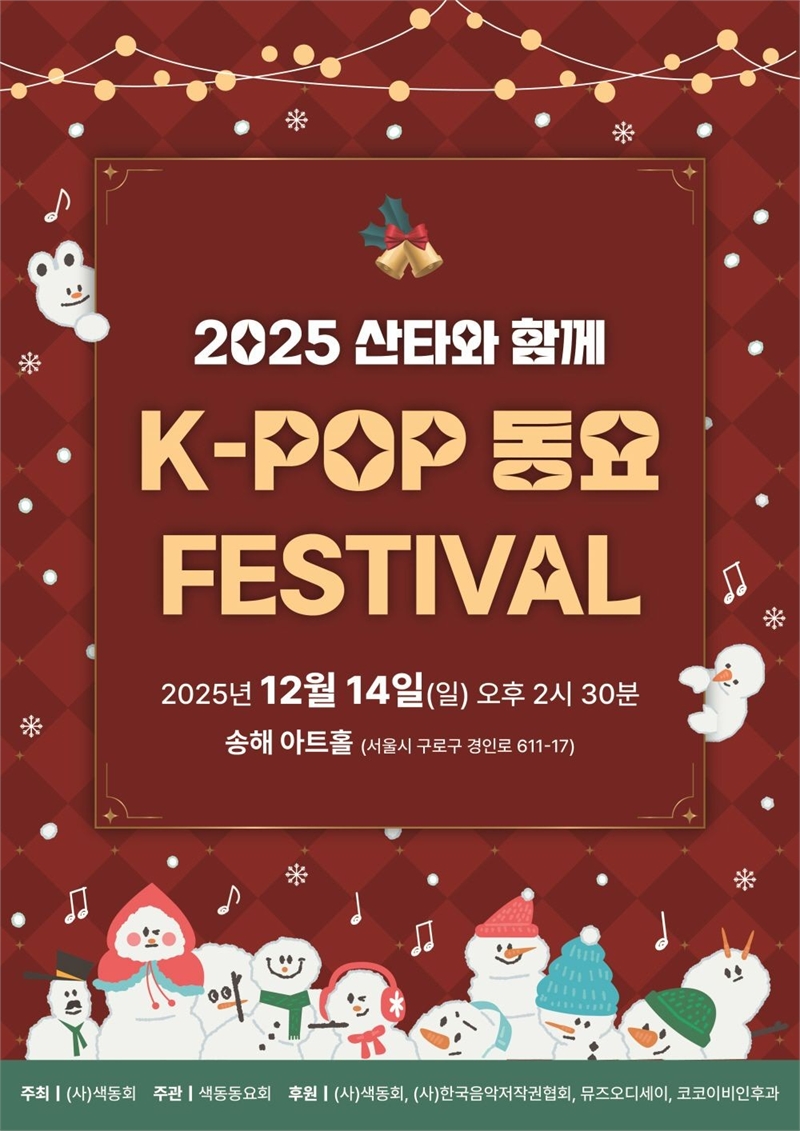 산타와 함께하는 ‘K-POP 크리스마스 동요 페스티벌’이 오는 14일 송해기념관 송해아트홀에서 열린다.이번 공연은 이날 오후 2시 30분부터 시작되며, 어린이들이 직접 무대의 주인공으로 나서 크리스마스 분위기를 가득 채우는 동요 축제로 꾸며진다. 행사는 사단법인 색동회가 주최하고 색동동요회가 주관하며, 사단법인 색동회,
