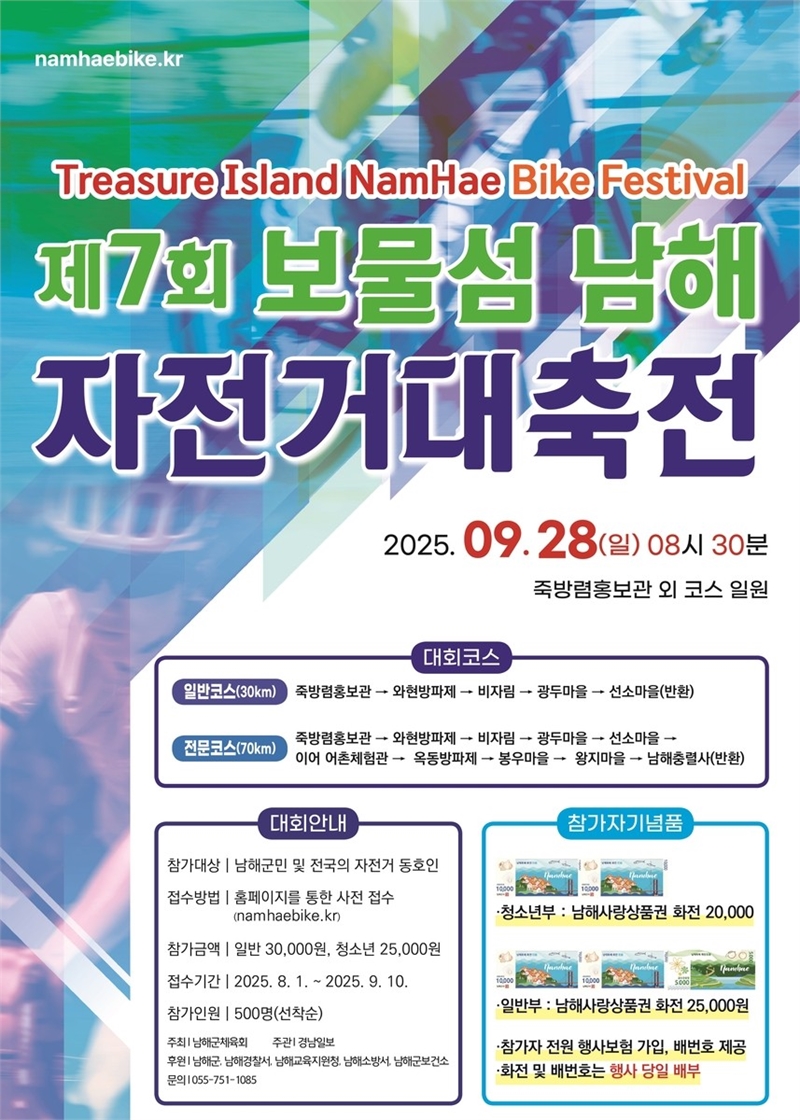 남해군은 오는 9월 28일 삼동면 죽방렴홍보관에서 ‘제7회 보물섬 남해 자전거 대축전’을 개최한다고 밝혔다. 이번 대회는 남해군체육회가 주최하고 경남일보사가 주관한다.대회는 죽방렴홍보관을 출발해 해안도로를 거쳐 설천면 남해충렬사까지 이르는 왕복 70km 구간에서 진행된다. 순위 경쟁이 아닌 투어 형식으로 열리며, 일반인과