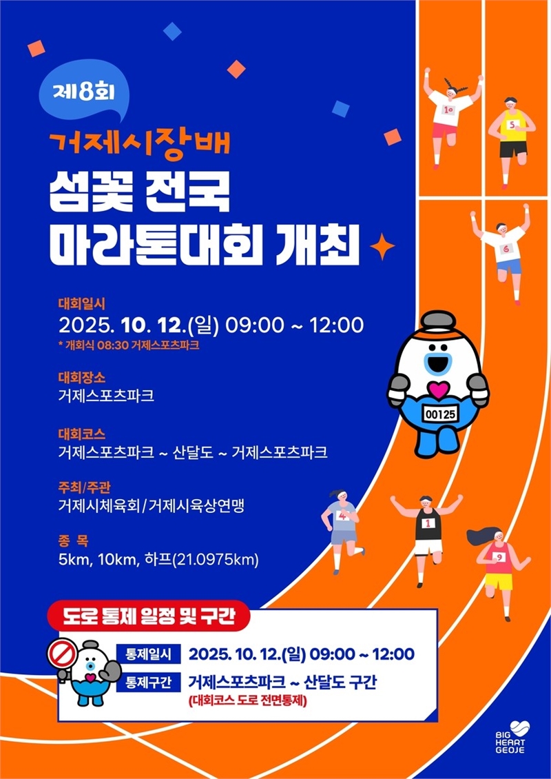 경남 거제시는 오는 12일 거제면 거제스포츠파크 일원에서 ‘제8회 거제시장배 섬꽃 전국마라톤대회’를 개최한다고 밝혔다. 이번 대회는 거제시육상연맹이 주관하며, 하프·10㎞·5㎞ 등 3개 부문에 전국 각지에서 모인 6천600여 명의 마라토너가 참가한다.시는 참가자의 안전과 원활한 경기 진행을 위해 대회 당일 오전 9시부터