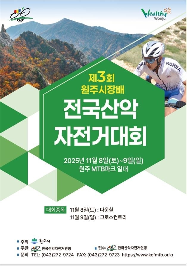 원주시는 오는 11월 8일부터 9일까지 신림면 원주산악자전거파크와 피노키오 숲 일원에서 ‘제3회 원주시장배 전국산악자전거대회’를 개최한다고 밝혔다. 이번 대회는 산림레포츠 활성화를 목표로 원주시가 주최하고 한국산악자전거연맹이 주관하며, 전국의 산악자전거 동호인과 엘리트 선수들이 참가할 예정이다.경기는 크로스컨트리(XC)와