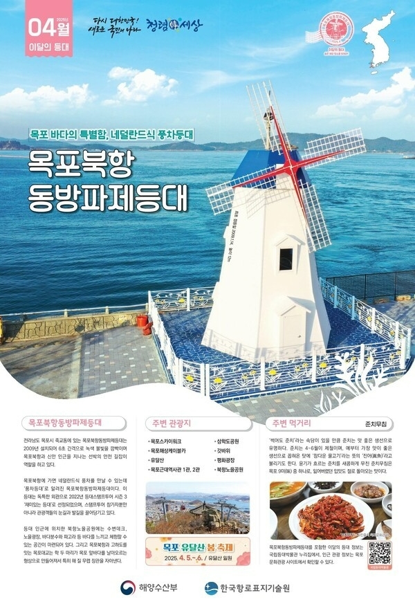 해양수산부는 4월의 등대로 전라남도 목포시 죽교동에 위치한 ‘목포북항동방파제등대’를 선정했다고 밝혔다.2009년 설치된 이 등대는 6초 간격으로 깜빡이는 녹색 불빛으로 목포북항을 오가는 선박의 안전을 지키고 있다. 특히 네덜란드식 풍차 형태를 본뜬 독특한 외관 덕분에 ‘풍차등대’라는 별칭으로도 잘 알려져 있으며, 2022
