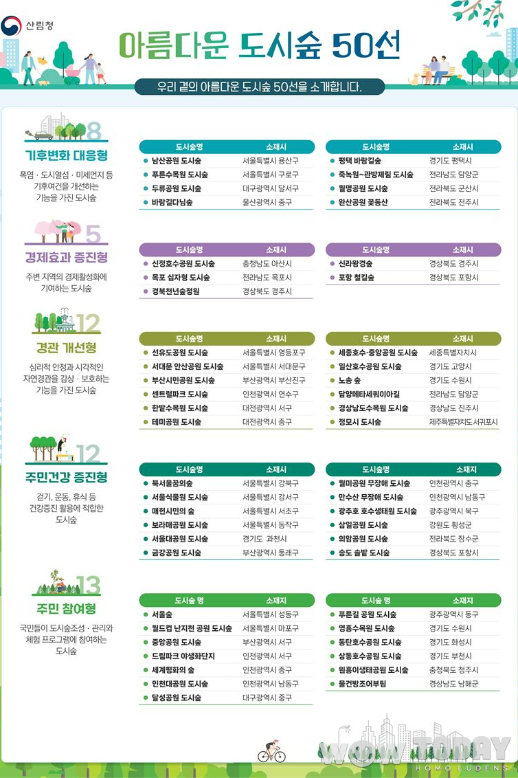 선정된 50개의 도시숲은 그 역할과 기능에 따라 △기후변화 대응형 △경제효과 증진형 △경관 개선형 △주민건강 증진형 △주민 참여형 등 5가지 유형으로 분류됐다.