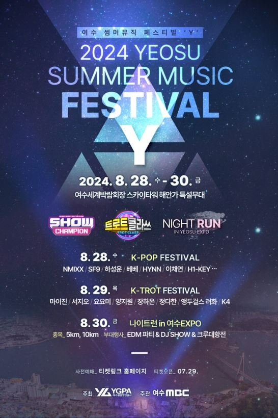 여수에서 열리는 여름 최대 축제 '썸머뮤직페스티벌 Y'가 8월 28일부터 3일간 여수세계박람회 스카이타워 일대에서 개최됩니다. 이번 행사는 여수광양항만공사가 주최하고 여수 MBC가 주관하며, K-POP, K-TROT, K-SPORTS 이렇게 세 가지 테마로 진행됩니다.