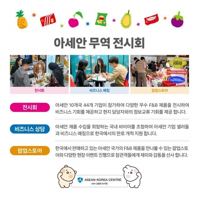 2009년부터 매년 진행 중인 ‘아세안 무역전시회’는 아세안 10개국 기업을 한국에 초청해 각국의 식음료(F&B) 제품을 소개하고, 국내 바이어와의 비즈니스 상담 기회를 제공하는 센터의 대표 프로그램이다. 6월 롯데백화점 본점에서 진행된 사전행사인 ‘아세안 팝업스토어 - 아세안 플레이버 타운’의 성공적인 개최에 이어, 이번 무역전시회는 한국에 소개되지 않은 아세안 현지의 다양한 식음료 제품을 소비자에게 선보이며, 아세안 기업들이 한국 바이어들과 비즈니스 파트너십을 구축할 수 있는 B2B 네트워킹 플랫폼을 제공한다.