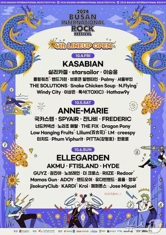 '2024 부산국제록페스티벌'은 오는 10월4일에서 6일, 사상 삼락생태공원에서 펼쳐지며 이번 축제에는 영국 레스터 출신의 대표적인 록밴드 ‘카사비안(KASABIAN)’과 수많은 인기곡을 보유한 영국 싱어송라이터 앤 마리(ANNE-MARIE), 일본 펑크록을 대표하는 밴드인 엘르가든(ELLEGARDEN)이 헤드라이너로 발표돼 큰 화제가 된 바 있다.