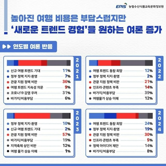 2021년에는 정부의 여행 지원 정책으로 코로나19 재확산을 우려하는 중립 의견이, 2022년에는 일부 현지 상인의 바가지 행태로 인해 비용 부담을 호소하는 중립 의견이 눈에 띄었다. 2023년에는 정부의 현금성 대책에 대한 비판 의견이 증가했지만, 올해 들어서는 여행 동참을 희망하는 긍정 반응이 증가했다.