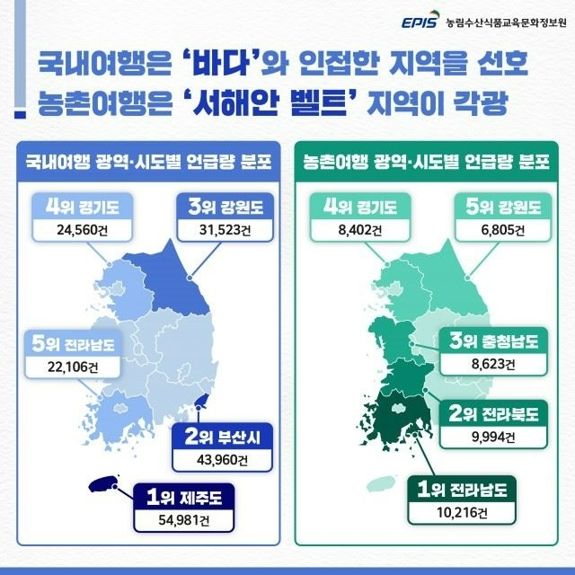 특히 국내 여행은 ‘바다’와 ‘워케이션’으로 주목받는 지역이, 농촌여행은 휴식·경험·학습을 중시하는 ‘런케이션(Learning+Vacation)’을 추구하는 경향이 강했다. 아울러 농촌여행은 전남-전북-충남-경기 등 서해안에 인접한 지역들이 순서대로 높은 언급량을 보이며 ‘서해안벨트’를 형성하고 있는 것을 확인할 수 있었다.
