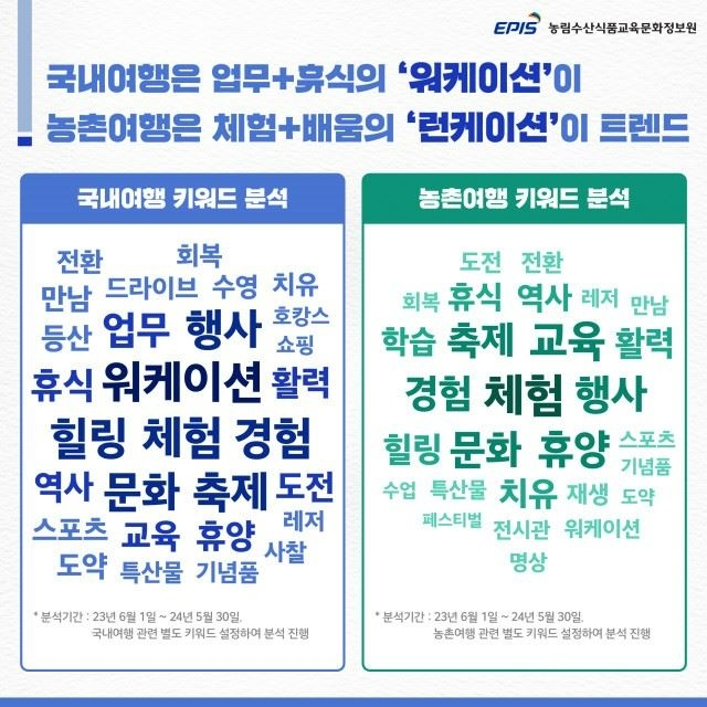 농림수산식품교육문화정보원(원장 이종순, 이하 농정원)이 ‘국내 여행 및 농촌여행 트렌드’를 주제로 온라인 언급량과 키워드를 비교 분석한 ‘FATI (Farm Trend&Issue)’ 보고서 17호를 발표했다.
