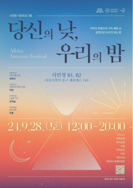 서울시청 시민청이 9월을 맞아 시민 참여형 문화예술축제 ‘당신의 낮, 우리의 밤’을 오는 9월 28일 서울시청 시민청에서 개최한다. ‘당신의 낮, 우리의 밤’에서는 시민들이 무료로 다양한 문화예술 프로그램을 체험할 수 있다.