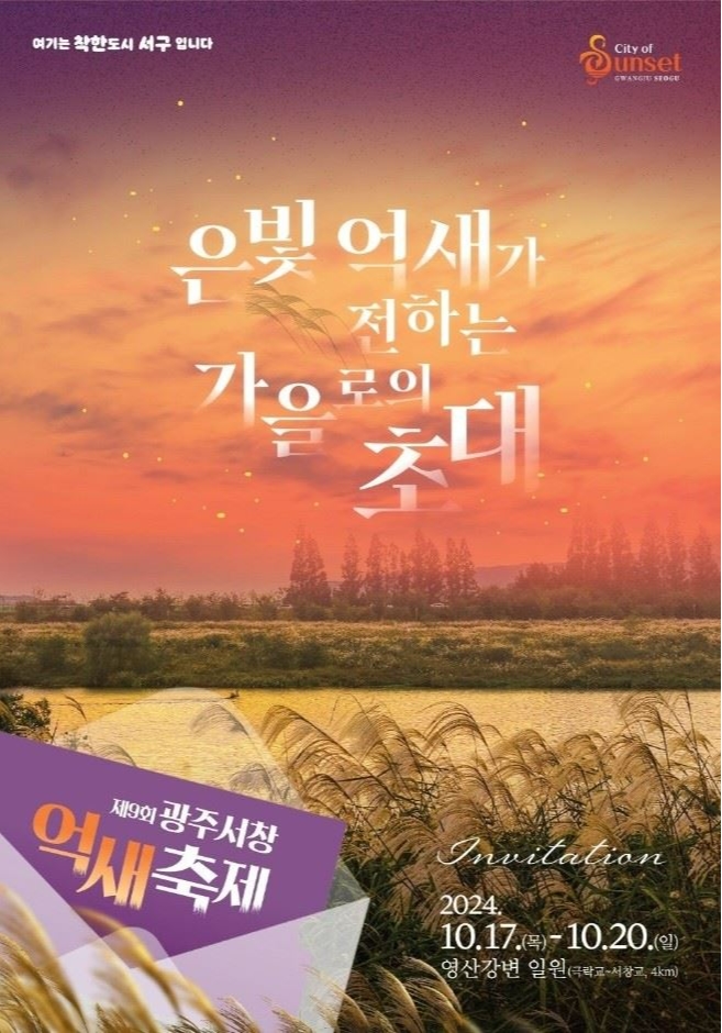김이강 서구청장은 “서창억새축제는 영산강변의 은빛 억새와 붉은 노을이 만들어내는 천혜의 경관을 만끽할 수 있는 도심 속 힐링축제”라며, “사랑하는 사람들과 함께 최고의 장소에서 최고의 시간을 보낼 수 있는 축제를 만들겠다”고 포부를 밝혔다.