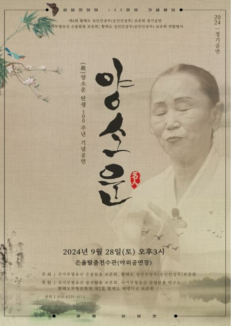 대한민국 국악계 해서탈춤의 거목 고(故) 양소운 선생의 탄생 100주년을 기념하는 대규모 특별 공연이 10월 28일 인천 은율탈춤 전수관 야외공연장에서 열린다. 공연은 국가무형유산 은율탈춤보존회와 황해도 성인인상무보존회가 함께 주최한다.