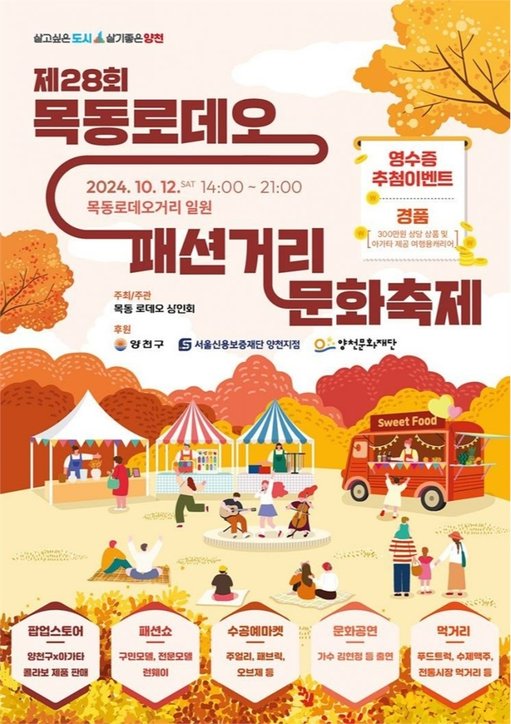 서울 양천구는 오는 12일 목동로데오거리에서 ‘제28회 목동로데오패션거리 문화축제’를 연다. 이번 축제는 ‘패션&뷰티’를 주제로 다양한 볼거리와 즐길 거리를 선사하며, ▲메인무대 ▲팝업스토어 ▲수공예마켓 ▲체험부스 ▲먹거리존 등 다채로운 프로그램으로 구성된다.