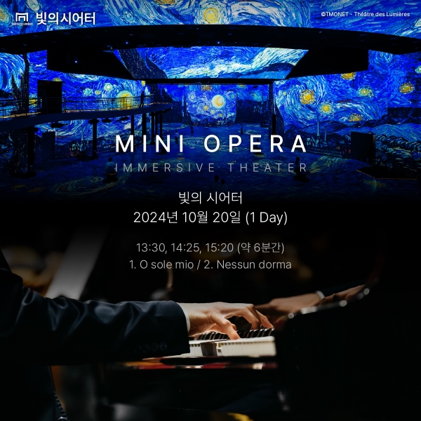 서울 광진구 워커힐 호텔앤리조트에 위치한 빛의 시어터가 오는 10월 20일 미니 오페라 공연을 선보인다. 미니 오페라는 현재 전시 중인 롱쇼 ‘베르메르부터 반 고흐까지, 네덜란드 거장들’展과 숏쇼 ‘색채의 건축가, 몬드리안’展 상영 이후 약 6분 동안 진행된다. 공연은 총 세 차례 운영하며 각각 오후 1시 30분, 2시 25분, 3시 20분에 맞춰 시작한다. 일반적인 오페라 공연은 무대와 객석이 분리돼 있는 것과 달리, 빛의 시어터는 무대와 객석의 경계가 없어 아티스트와 관객이 한 공간에 위치해 관객들의 시각적·청각적 몰입을 극대화한다.