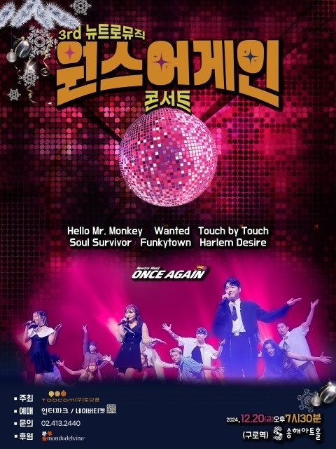 원스어게인은 ‘생지옥’ 발매와 함께 송년 콘서트 소식도 알려왔다. 이번 송년 콘서트는 12월 20일(금) 19시 30분 서울 구로구의 송해아트홀에서 열린다. 기존의 유로댄스 레퍼토리와 처음으로 선보이는 원스어게인의 오리지널곡 라이브까지 즐길 수 있는 공연으로 준비할 예정이다. 공연 1시간 전부터 로비에서 스파클링와인과 함께 소통할 수 있는 장도 마련된다.