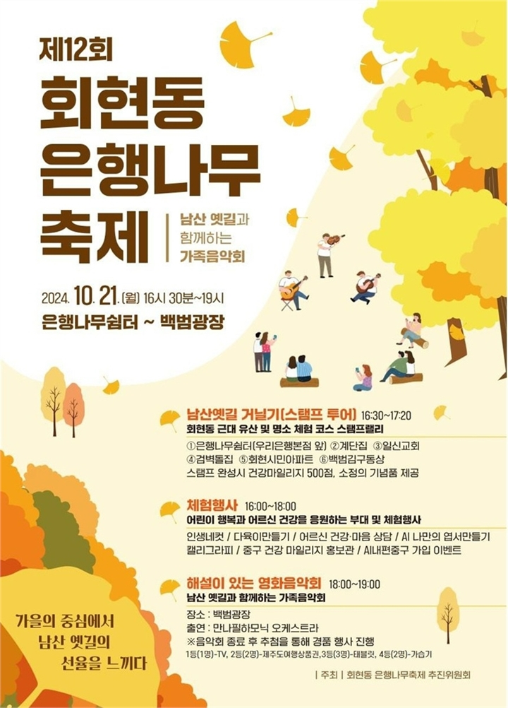 김길성 구청장은 “500년 역사를 간직한 회현동 은행나무와 함께 지역의 역사문화 자원을 경험할 수 있는 특별한 축제”라며 “과거와 현재, 도시와 자연이 조화롭게 어우러진 회현동의 매력을 느껴보길 바란다"고 말했습니다.