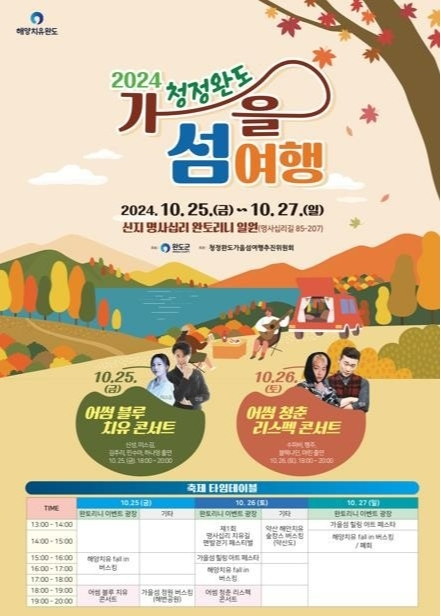 전남 완도군이 오는 10월 25일부터 27일까지 '2024 청정 완도 가을 섬 여행' 행사를 완도해양치유센터 일원에서 개최합니다. 이번 축제는 가을의 아름다운 자연 속에서 몸과 마음을 치유할 수 있는 다양한 프로그램으로 구성되었습니다.