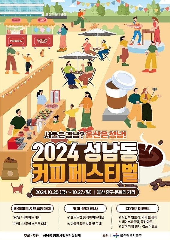 울산 중구 성남동 문화의거리에서 오는 10월 25일부터 27일까지 '2024 성남동 커피페스티벌'이 개최됩니다. 이번 행사는 성남동 카페 상인들이 주도해 기획한 축제로, 커피 문화를 확산하고 지역 상권을 활성화하기 위해 마련되었습니다.
