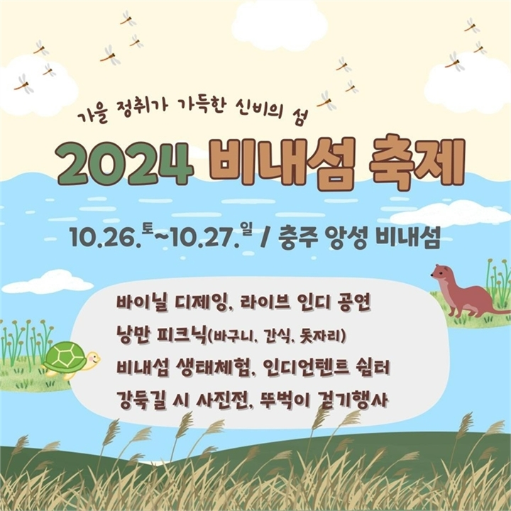 충주시는 오는 10월 26일부터 27일까지 이틀간 앙성면 비내섬에서 '2024 비내섬 축제'를 개최한다고 밝혔다. 이번 축제는 아름다운 자연 경관과 다양한 문화 행사가 어우러진 생태친화적인 축제로, 자연 속에서 가을의 정취를 만끽할 수 있도록 꾸며질 예정이다.