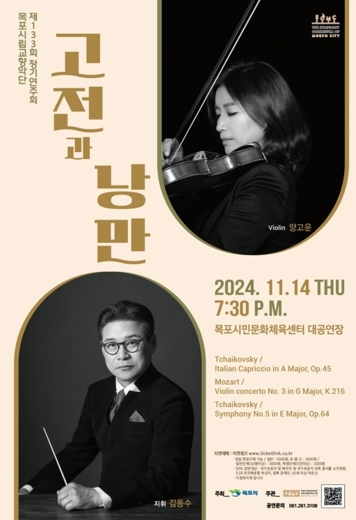 목포시립교향악단은 오는 11월 14일 오후 7시 30분 목포시민문화체육센터에서 제133회 정기연주회를 개최한다고 밝혔다. 이번 연주회는 김동수 지휘자의 지휘로 차이콥스키의 '이탈리아 기상곡'과 '교향곡 5번', 모차르트의 '바이올린 협주곡 3번'을 선보일 예정이다.