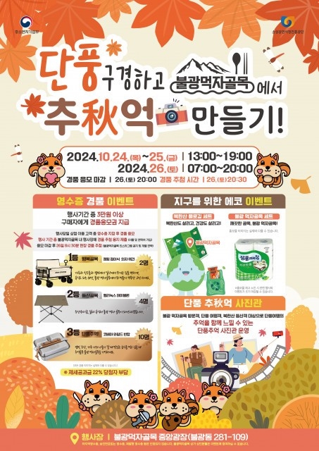 행사는 24일부터 26일까지 불광 먹자골목 원형광장에서 진행된다. 26일 주말에는 오전 7시부터 불광역 일대 등산객에게 생분해 비닐봉지, 간식, 핫팩 등이 담긴 생태 친화적 플로깅 키트를 선착순 배포한다. 또한 원형광장에서는 ‘단풍 추秋억 사진관’에서 즉석 사진인화 서비스를 제공한다.