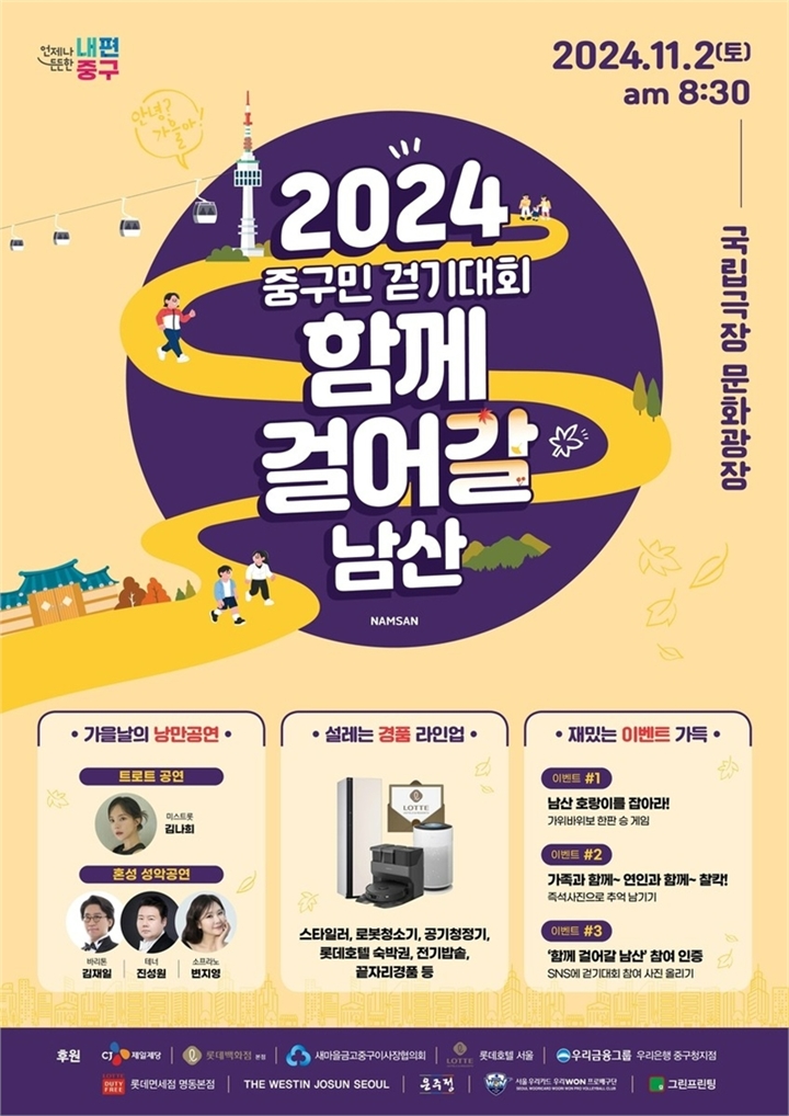 서울 중구(구청장 김길성)는 오는 11월 2일 오전 8시 30분 국립극장 문화광장에서 중구민 걷기대회 '함께 걸어갈 남산'을 개최한다고 밝혔다. 걷기 코스는 국립극장을 출발해 석호정을 지나 필동쉼터를 반환점으로 돌아오는 남산 북측순환로 4.5km 구간이다.