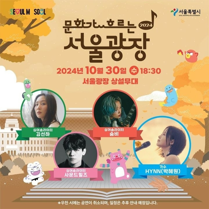 서울시는 가을을 맞아 오는 10월 30일 서울광장에서 '문화가 흐르는 서울광장' 특별공연을 개최한다고 밝혔다. 이번 공연에는 발라드 가수 HYNN(박혜원), 싱어송라이터 숨비, 김선하, 사운드힐즈가 참여해 다채로운 무대를 선보인다.